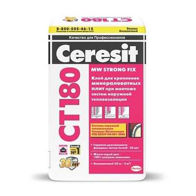 Клеевая смесь CT 180 предназначена для крепления минераловатных теплоизоляционных плит на минеральных основаниях при устройстве систем наружной теплоизоляции фасадов Ceresit WM.